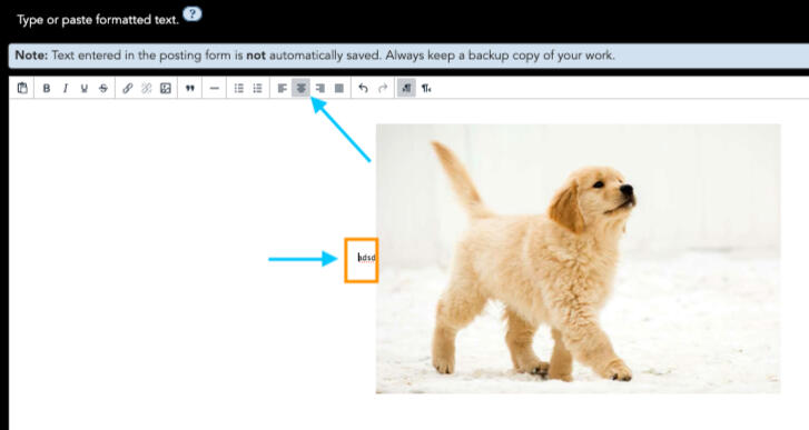 💫 3RD (OPTIONAL): if you want to center your images, it's easiest to add a little text next to your uploaded image, center align it, then delete the text.