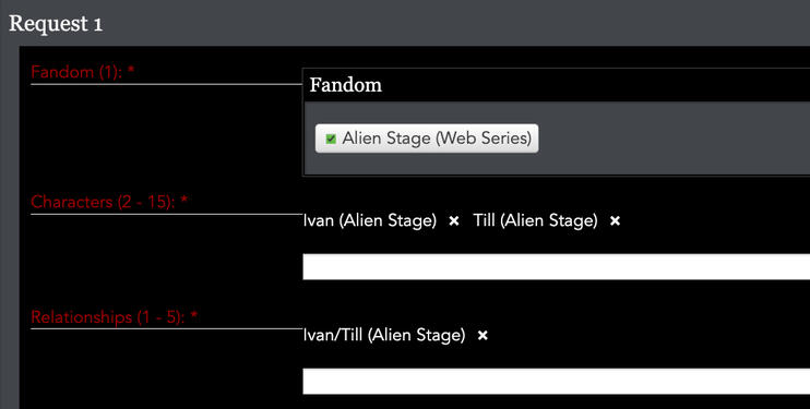 →fandom: the only fandom, by default, is alien stage. if you are interested in a crossover, please indicate your desired crossover in the optional tags section.→characters: inputting ivan & till is required, but you can request up to 15 characters from the cast.→relationships: inputting "ivan/till" OR "ivan & till" is required, but you can request up to 4 background ships.