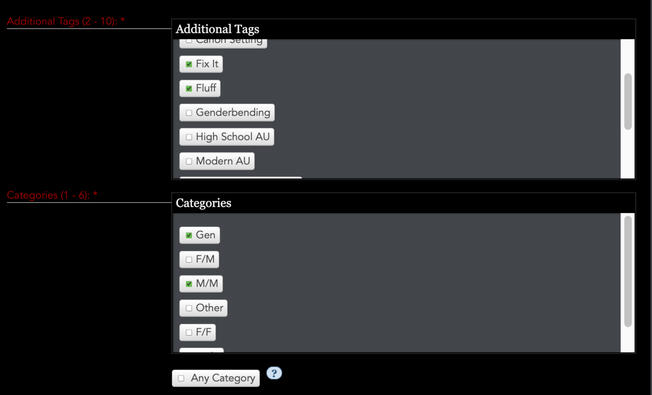→additional tags: the tagset for the exchange is default. you must select at least 2 tags in order to be effectively matched.→categories: refers to your gender/dynamic preference. "gen" refers to a non-romantic approach. selecting "any category" will OVERRIDE any selections. please only select this option if you are truly comfortable with any/all interpretations.