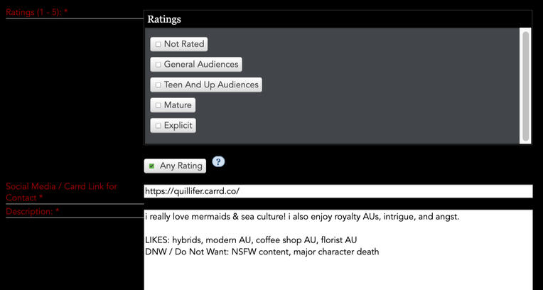 →ratings: refers to the max maturity of your request. you can only select an explicit request if you are 18+. please only select "any rating" if you are 18+ and if you are comfortable receiving work for any level of maturity as a gift.→social media link for contact: this can be a link to your carrd, linktree, etc. or it can be a link directly to twitter, instagram, etc. if you are requesting explicit content, your general age MUST be clearly stated on your social media. (EX: 18+, 20↑)this is required in case the mod team needs to contact you and you are unresponsive on discord.→description: this is where the magic happens! here, you will go into detail about what you are requesting from your giftee to write or draw for you.please feel free to go into as much detail as you like. *NOTE: it is best practice to put additional tags in your description AND in the "optional tags" section.sample description from the screenshot:i really love mermaids & sea culture! i also enjoy royalty AUs, intrigue, and angst.
