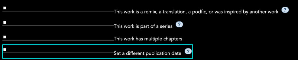 —FOR ALL CREATORS you can view your assignments on the sidebar of your ao3 homepage & you will want to update the publishing date to the date the exchange goes live IF you upload prior to the exchange's go-live date.